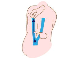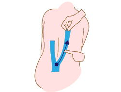 Y字の一方を背骨の横にそって肩甲骨の下まで貼る。